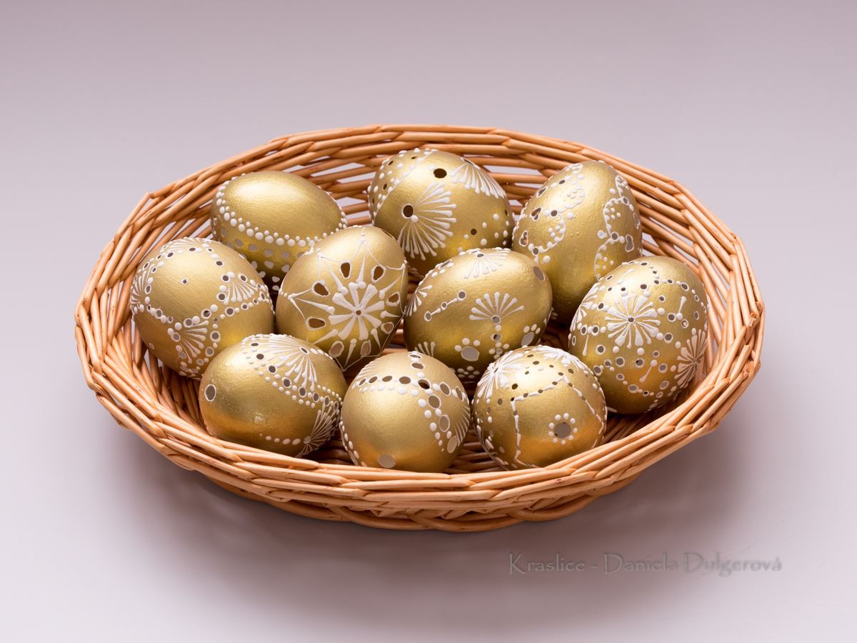 Dekoratívna sada 10 ks slepačích kraslíc. Zhotovené technikou madeira. Zdobené voskom.