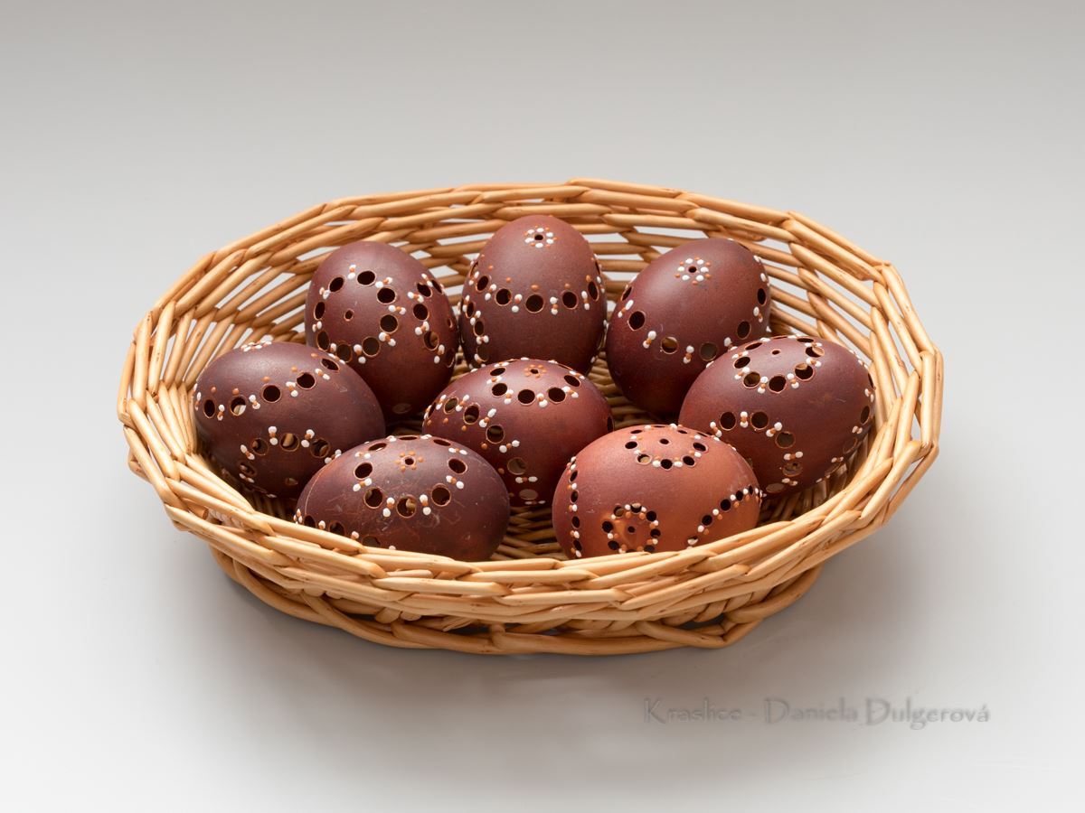 Veľkonočná slepačia kraslica farbená v cibuľových šupkách. Zhotovené technikou madeira. Zdobené voskom.